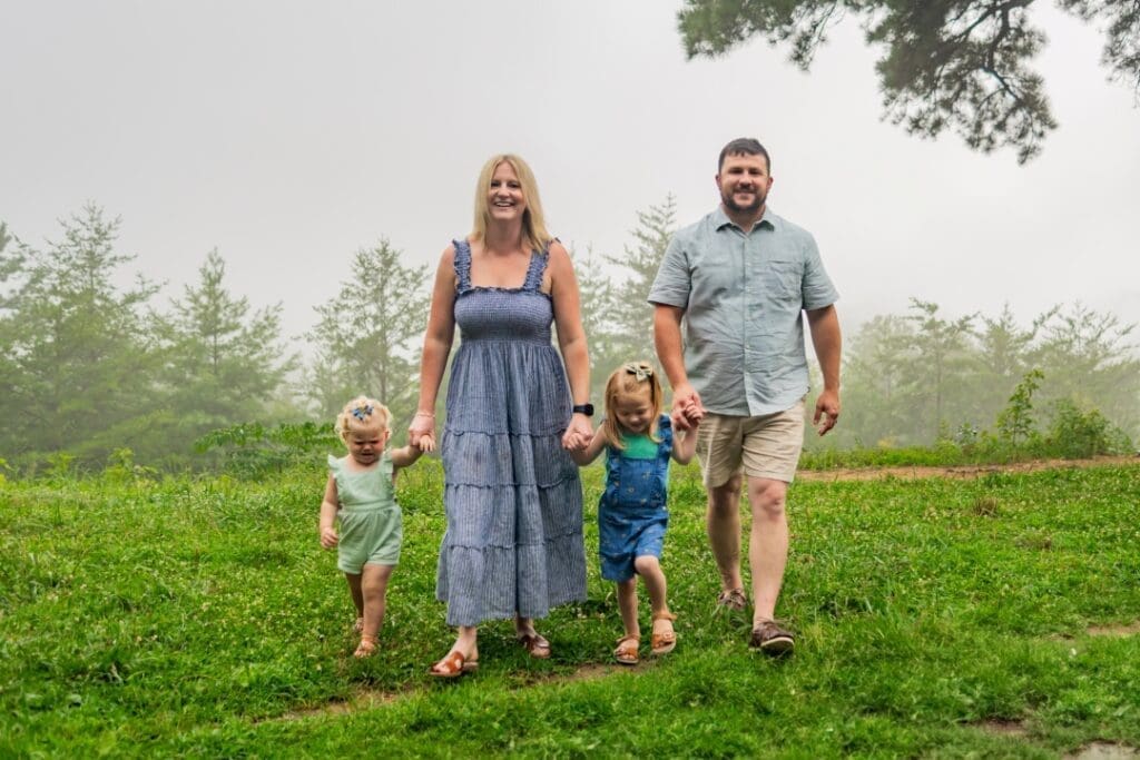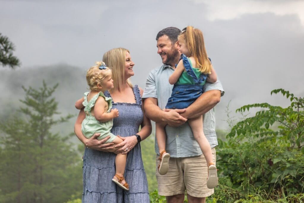 Our first few stops along the way were nothing but thick, smoky fog. The “smoke” in the Smoky Mountains can be beautiful and moody, but sometimes it hides those sweeping mountain views we’re all hoping for. With the Lemons Family’s easygoing spirit, we decided to keep driving, exploring, and chasing a little light. Eventually, we found a spot where the clouds lifted just enough to give us that magical backdrop.